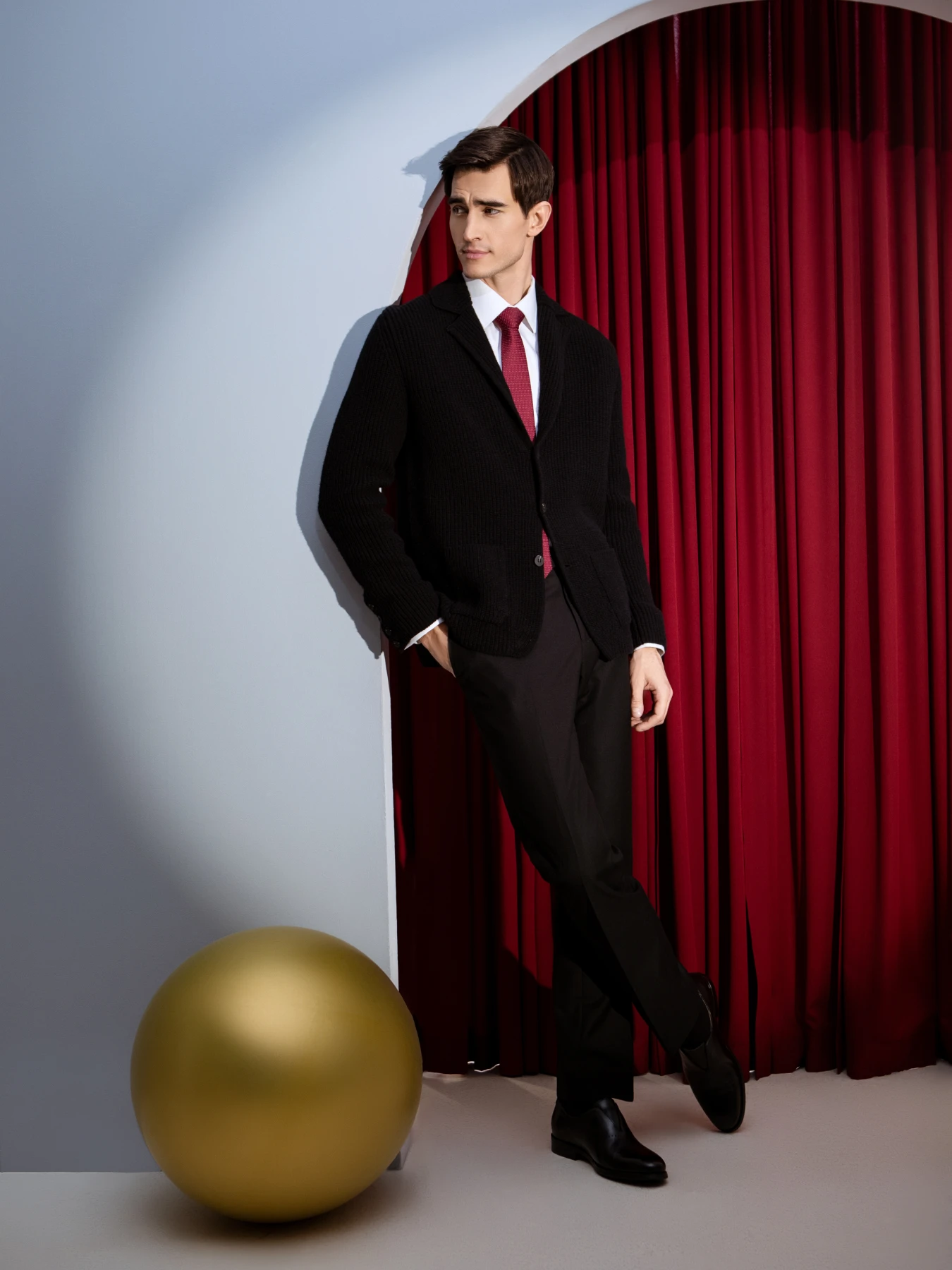 Идеальным выбором станет тёмно-синий, графитовый или черный пиджак из кашемира.