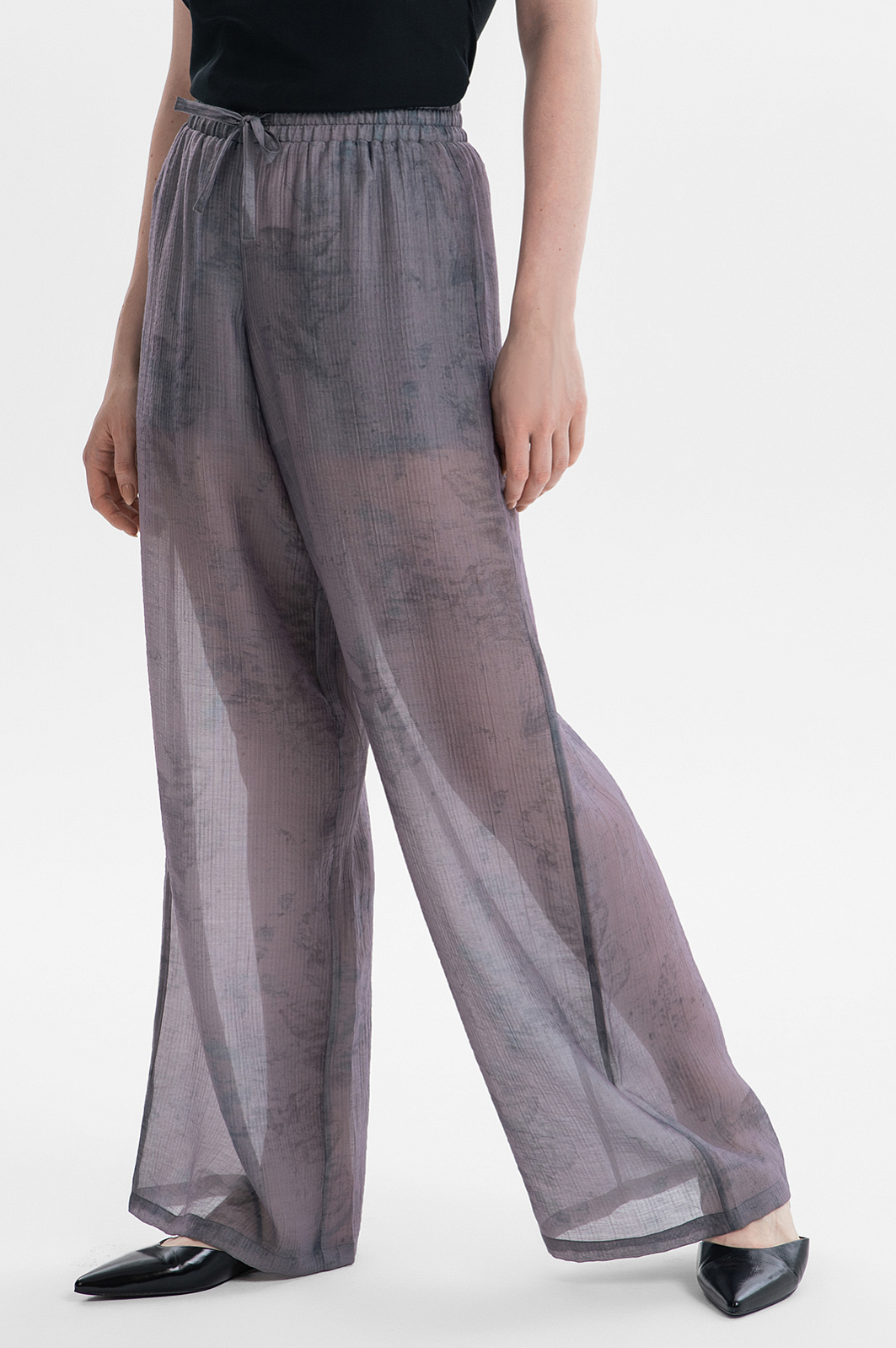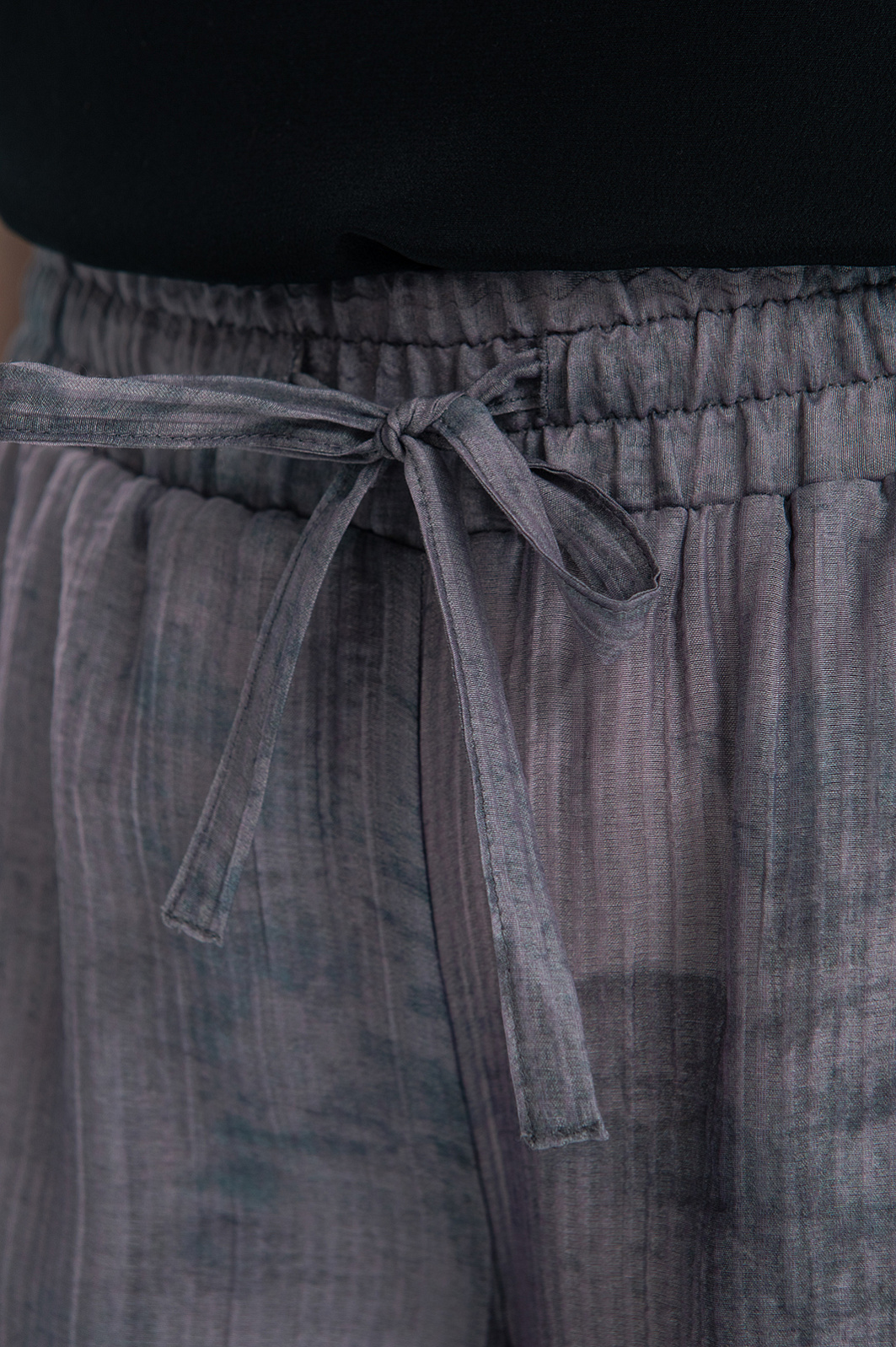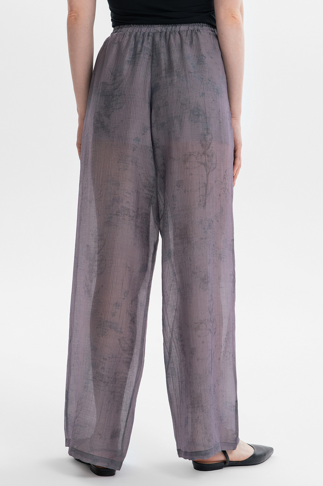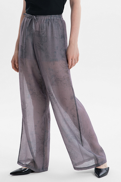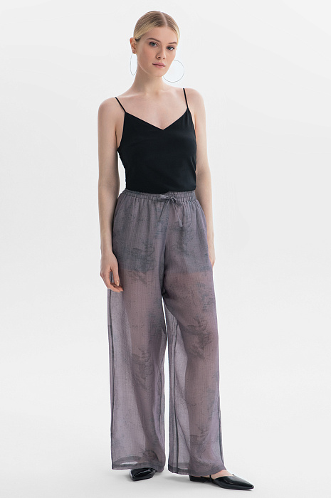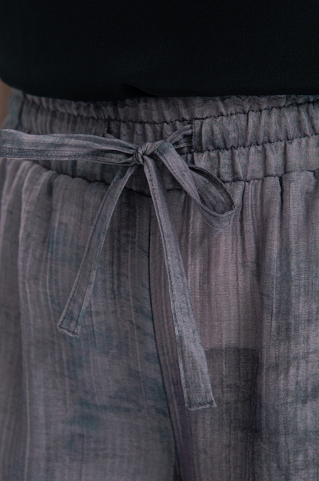 Свободные брюки KANZLER на кулиске из серого полупрозрачного фактурного тенсела с легким растительным принтом с подкладкой —женственная и романтичная модель, которая подойдет для расслабленного летнего отдыха и знойных вечеринок. Провокационность модели можно умерить удлиненным жакетом или длинным тонким кардиганом. Крой А-образного силуэта не сковывает движений, пояс-резинка с кулиской обеспечивает аккуратную посадку на фигуре любого типа. Красивая легкая фактурная ткань окутывает тело плотной дымчатой вуалью. Смесовой материал сделан из мягкого нежного тенсела, который хорошо пропускает воздух и сохраняет естественное тепло тела, и прочного износоустойчивого полиамида. Параметры модели: рост 175, 88-65-92 Размер на модели: S