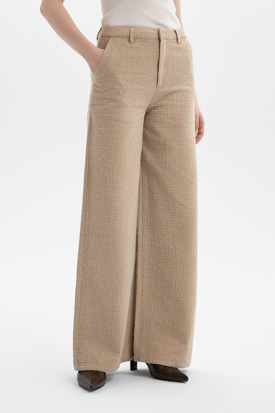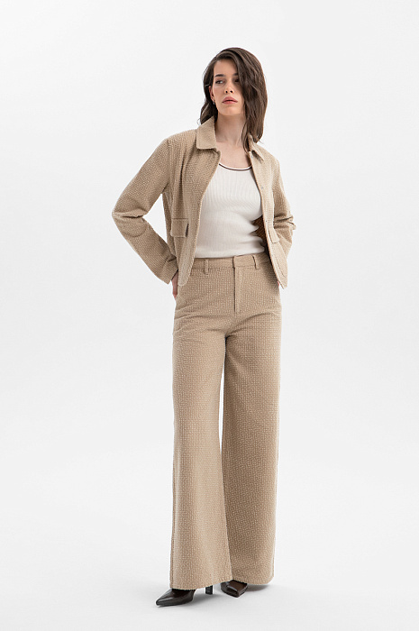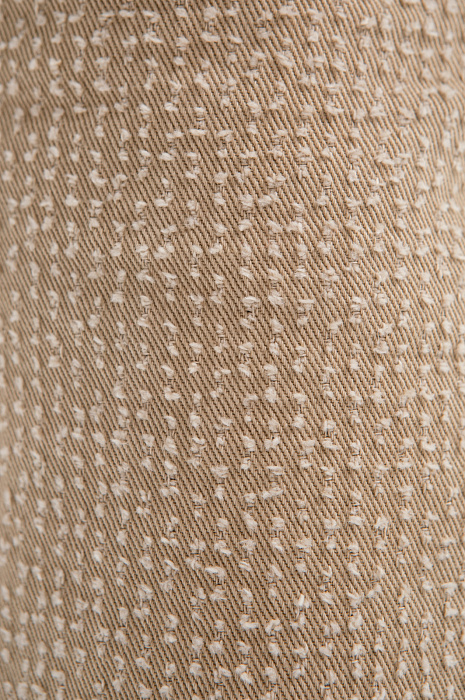 Брюки KANZLER из чистого хлопка — воплощение городского шика и комфорта. Тёплый карамельный оттенок легко сочетается с естественными оттенками, добавляя образу нарядность и изысканность. Расклешённый от бедра крой создаёт женственный силуэт, который подчёркивает линию талии и визуально удлиняет ноги. Особое внимание привлекает ткань. Белый ворс создаёт выразительный текстурный узор, придающим модели очарование. В составе материала — чистый гипоаллергенный хлопок, который обеспечивает ощущение свежести даже в жаркие дни. Саржевое плетение формирует плотную диагональную структуру, благодаря которой ткань хорошо держит форму и сохраняет аккуратный внешний вид.