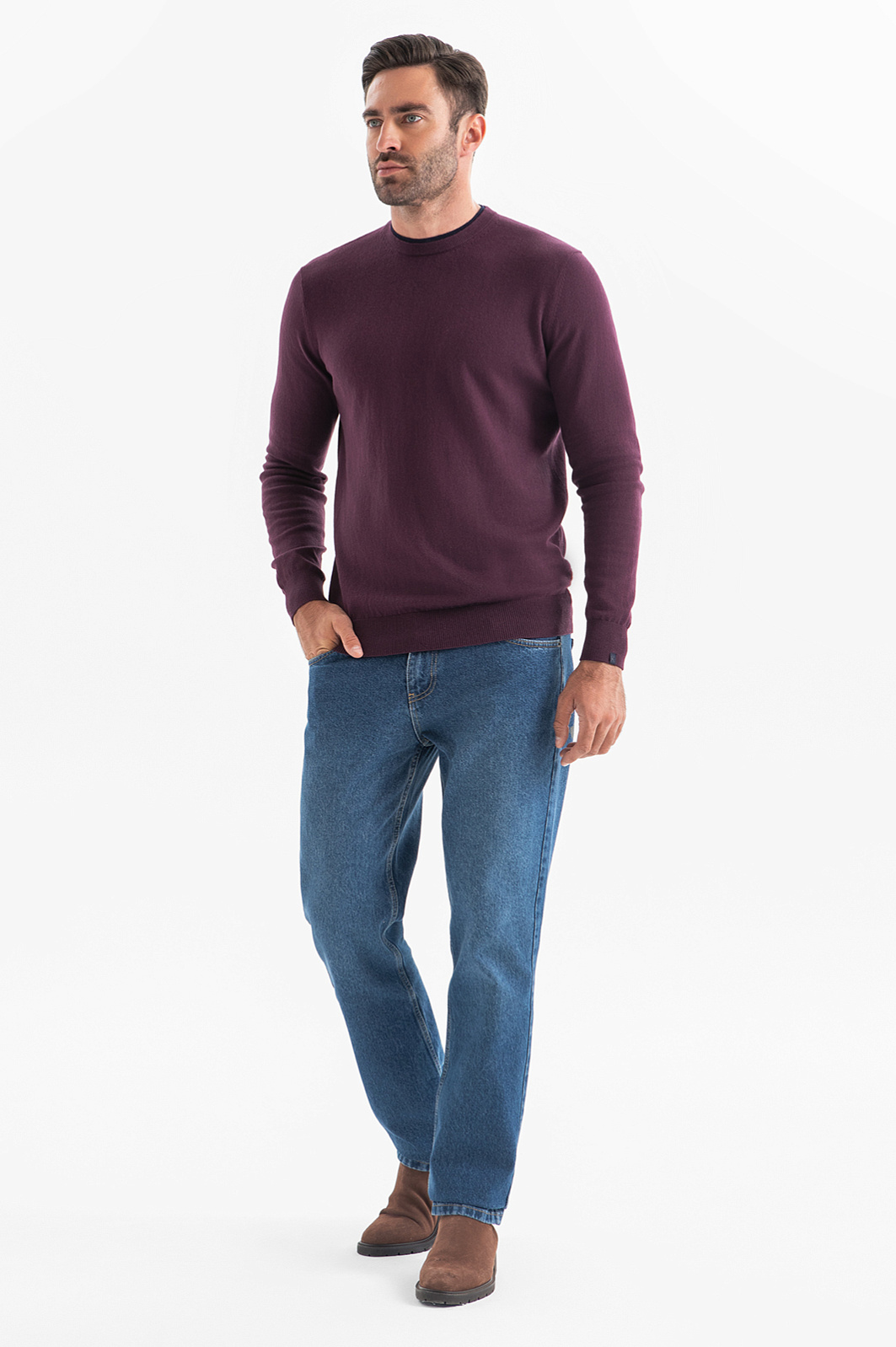 Универсальный классический джемпер KANZLER бордово-коричневого оттенка с небольшой фирменной нашивкой на манжете — идеальная модель для работы, отдыха и путешествий. Она сочетается с джинсами, слаксами, офисными брюками и может служить нижним слоем, если надеть куртку, свободный неформальный пиджак и кардиган. Натуральная эластичная ткань мягко облегает тело. Она создана из волокон хлопка с добавлением ценного кашемира. Гипоаллергенный дышащий хлопок не раздражает даже самую чувствительную кожу. Благородный кашемир добавляет материалу непревзойденную мягкость и нежность. Параметры модели: рост 192, 108-83-102 Размер на модели: M
