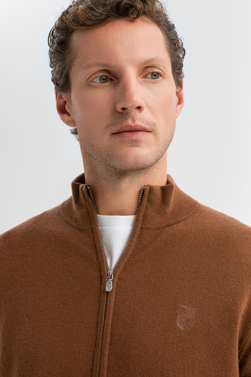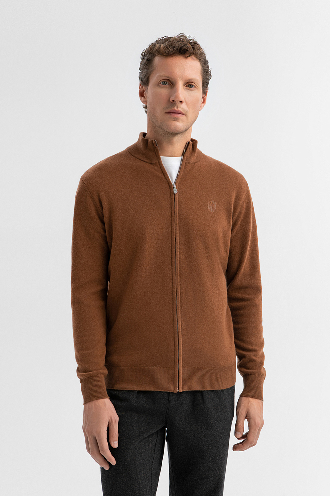Кардиган KANZLER на молнии из 100% шерсти в оттенке молочного шоколада — тёплый, лаконичный и стильный вариант для холодного сезона. Модель идеально сочетается с неформальными брюками и будет уместно смотреться как в рабочем пространстве, так и на отдыхе. Гладкая вязка подчёркивает чистоту линий и делает модель универсальной. Аккуратная вышитая эмблема на груди служит ненавязчивым, но узнаваемым акцентом. Высокий ворот с молнией позволяет носить джемпер как с отложенным воротником, так и в застёгнутом виде. Манжеты, воротник и низ оформлены трикотажными резинками, которые сохраняют форму и обеспечивают комфортную посадку. Материал сделан из мягкой пряжи (чистая шерсть), которая удерживает воздух между волокнами, создавая естественный терморегуляционный слой. Параметры модели: рост 188, 97-82-92 Размер на модели: M