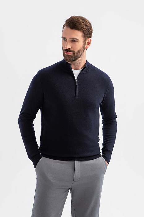 Джемпер KANZLER в глубоком темно-синем оттенке – сочетание натуральных материалов и продуманного дизайна. Состав – проверенная временем формула: шерстяные волокна (95%) обеспечивают идеальную терморегуляцию и сохраняют форму, а добавка кашемира (5%) придает материалу шелковистую фактуру и благородное сияние. Стильный воротник-стойка на молнии позволяет менять образ одним движением руки и регулировать комфортную температуру. Универсальный темно-синий оттенок – основа для множества образов – от деловых встреч до вечерних мероприятий. Модель подходит для создания многослойных сочетаний с футболкой. Параметры модели: рост 189, 102-80-99 Размер на модели: M