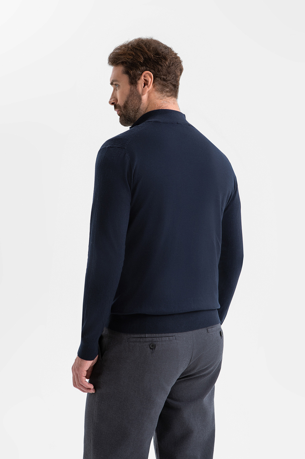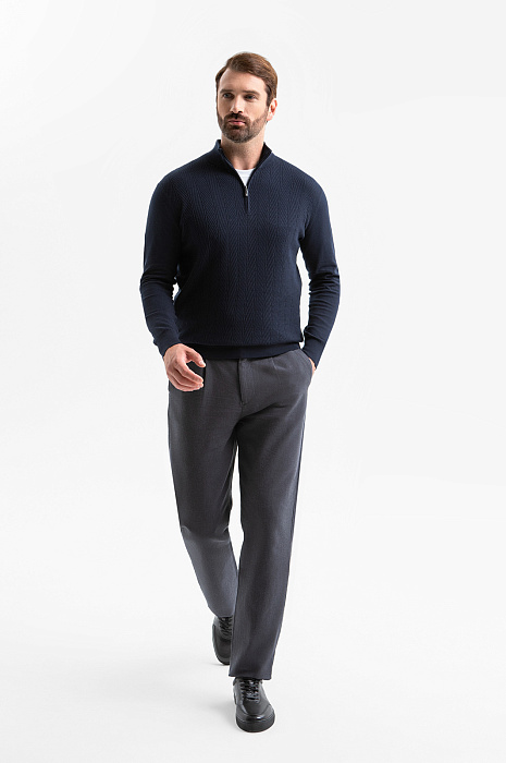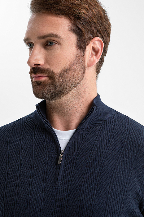 Джемпер KANZLER из хлопка и кашемира оттенка navy с молнией — воплощение комфорта и элегантности. Базовая модель для мужчины, который ценит качество, стиль и премиальные материалы. Переднюю часть украшает выразительный фактурный рисунок, образованный диагональным рубчиком и чёткими вертикальными линиями. Архитектурный дизайн подчеркивает строгость и аккуратность модели, делая её уместной как в деловом, так и в повседневном стиле. Вязаный трикотаж из натуральных волокон приятен к телу, мягко ложится по фигуре и обеспечивает комфорт в течение дня. Кашемир придаёт ткани изысканный вид и нежность, а гипоаллергенный хлопок — прочность, воздухопроницаемость и практичность.