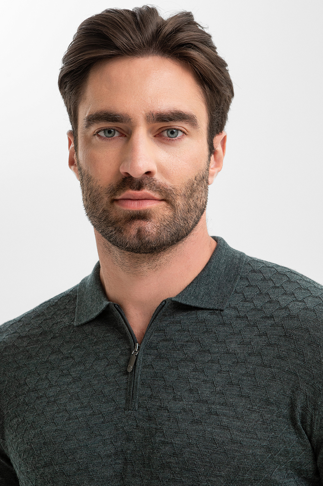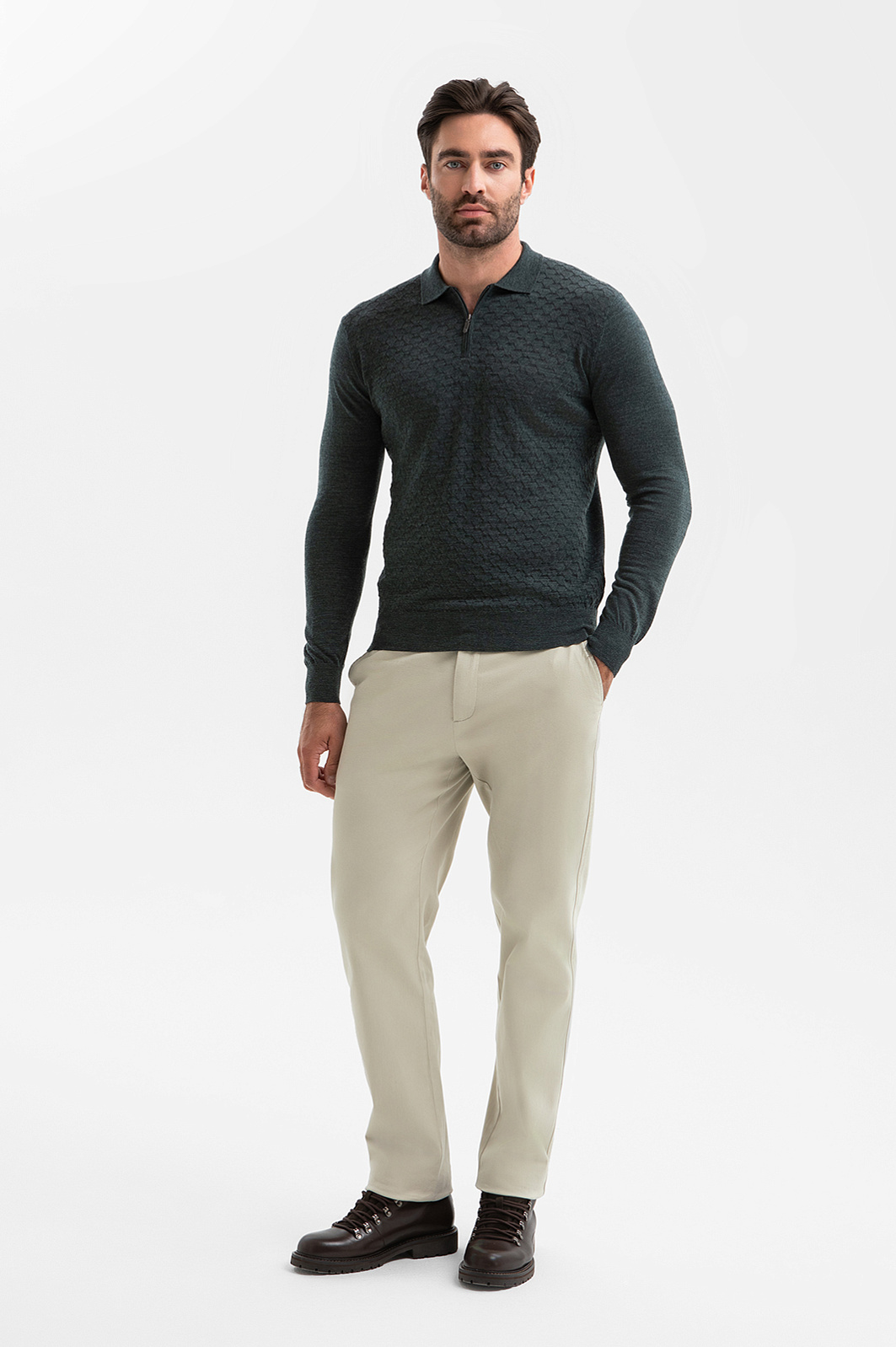 Джемпер поло KANZLER – воплощение мужской элегантности для тех, кто ценит детали. Фактурный узор подчеркивает красоту серо-зеленого оттенка и придает образу глубину. Материал – 100-процентная шерсть, мягкая и невесомая, обеспечивает идеальную терморегуляцию, не перегревая кожу. Эластичные волокна сохраняют форму после многократных стирок, что делает модель инвестицией в гардероб. Это выбор для кежуал-образов и неформального офисного дресс-кода в межсезонье и зимой. Параметры модели: рост 192, 108-83-102 Размер на модели: M