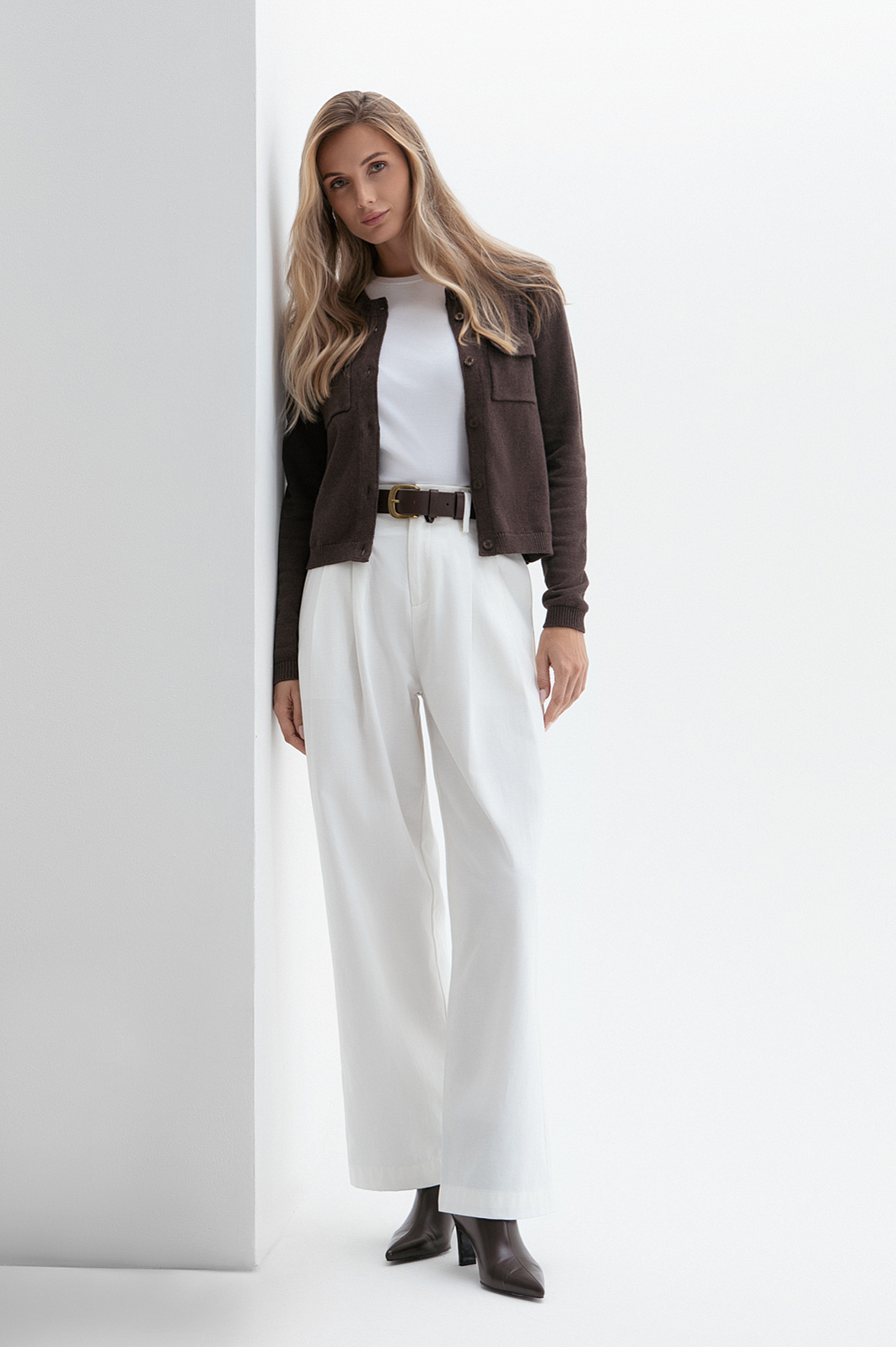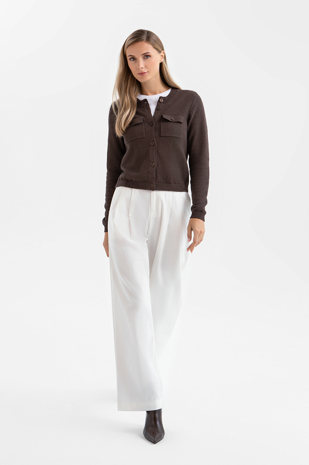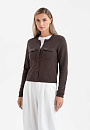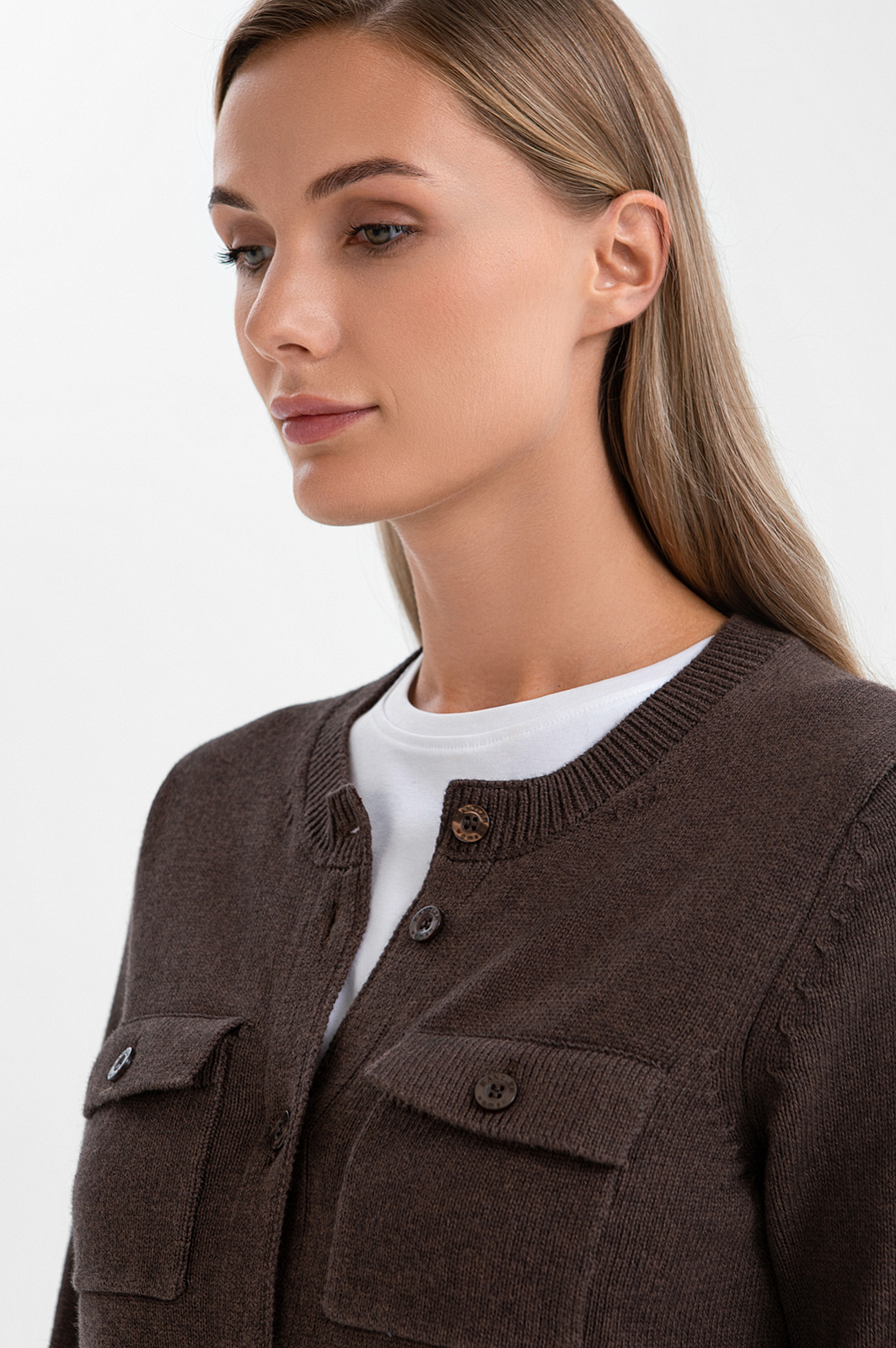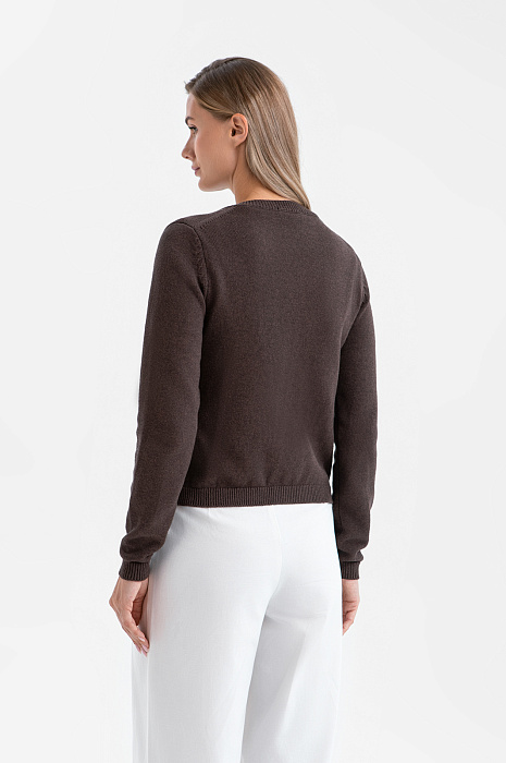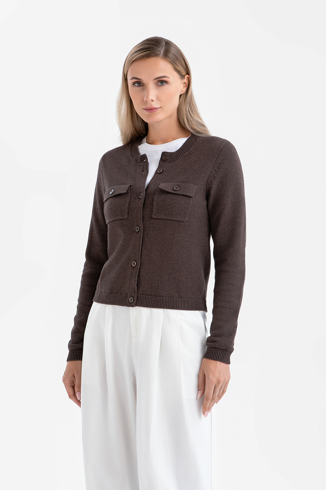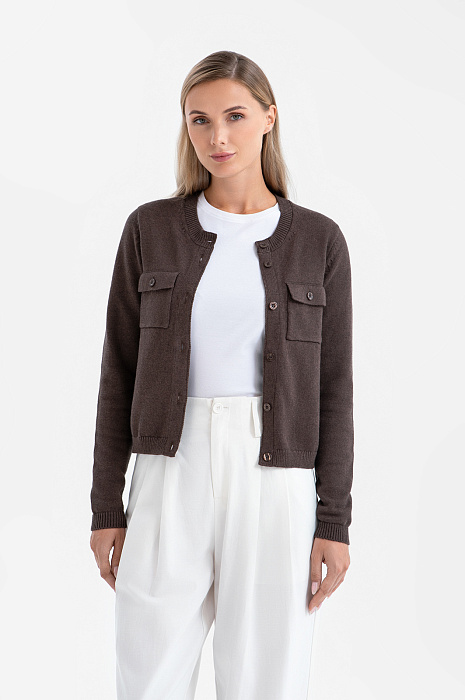Короткий кардиган KANZLER воплощает сдержанную элегантность. Это универсальный элемент гардероба для дневных прогулок, деловых встреч и уютных вечеров. Элементы в стиле сафари — нагрудные прямоугольные карманы на пуговицах — придают уютному образу структурированность и графичность. Шоколадный оттенок выглядит благородно и позволяет легко комбинировать модель с вещами естественных цветов. Вязаное полотно из хлопка с кашемиром сочетает в себе мягкость и тепло натуральных гипоаллергенных волокон и обеспечивает комфортное прикосновение к коже. Хлопок делает ткань воздухопроницаемой и практичной для повседневной носки, а кашемир придаёт ей лёгкость и нежность. Благородный дуэт поддерживает форму материала и повышает его износоустойчивость.