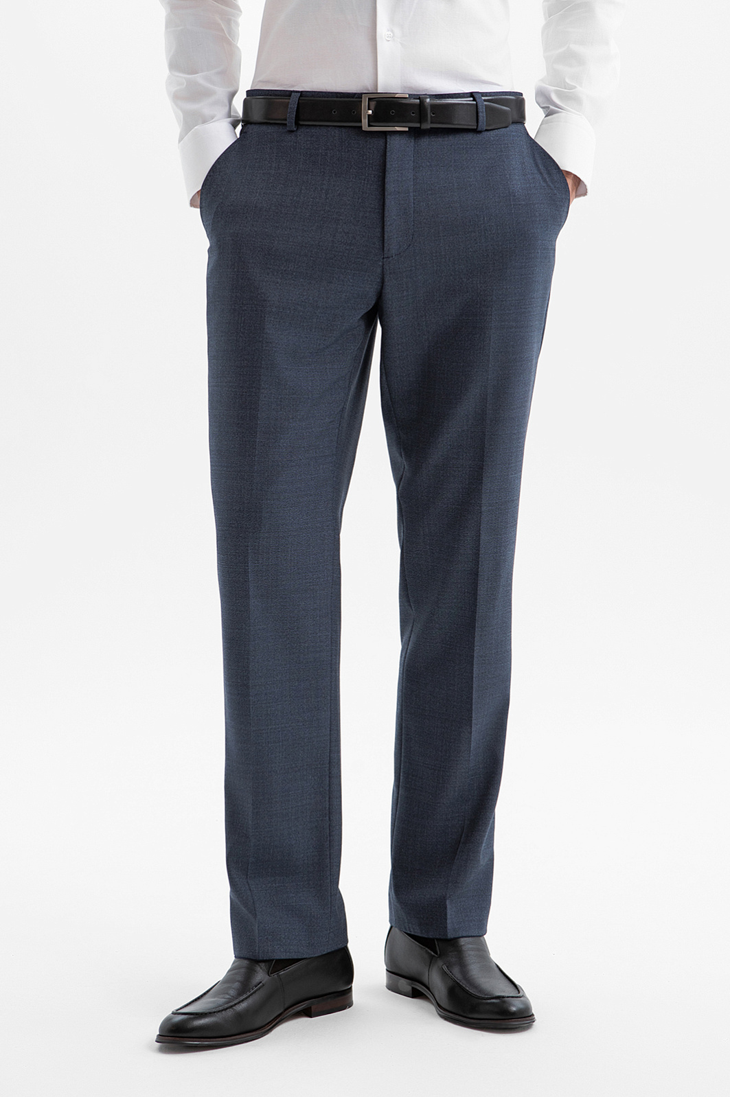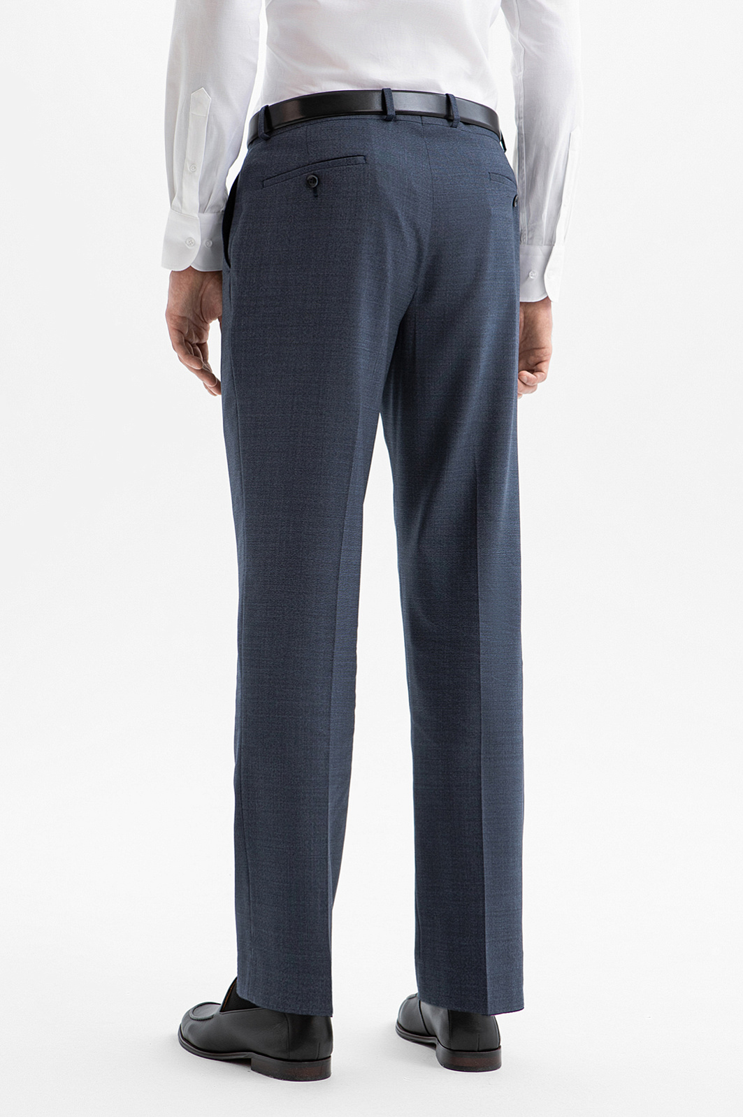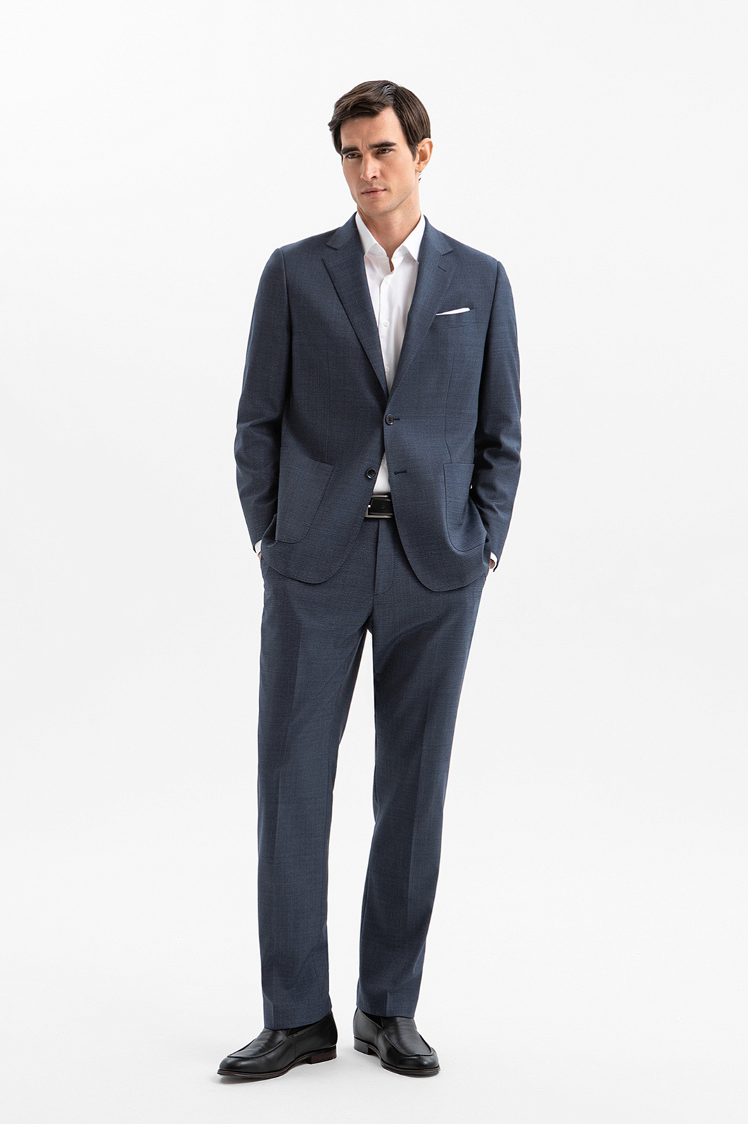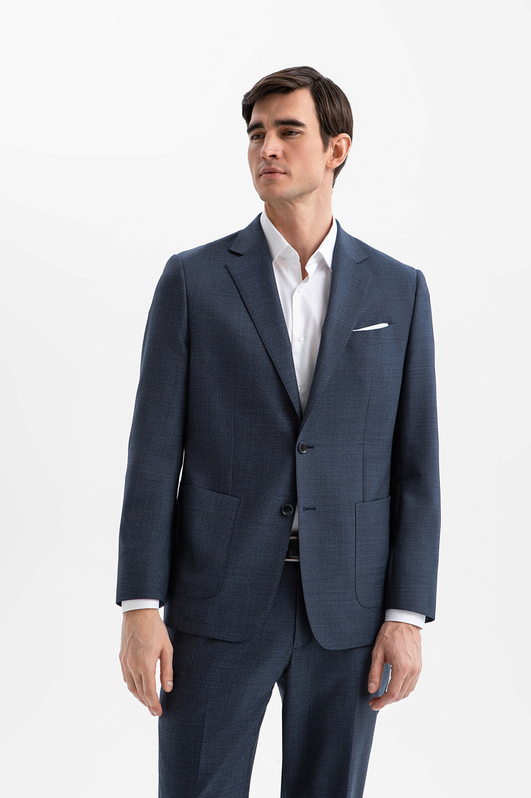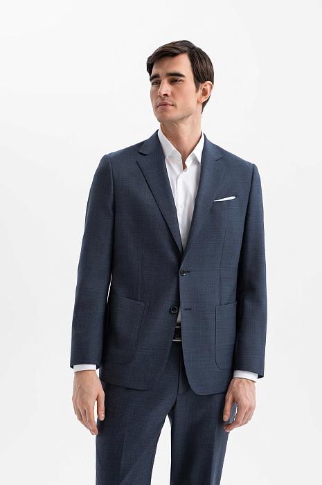 Классический костюм KANZLER из дорогой костюмной шерсти Супер 120S с водоотталкивающей обработкой глубокого синего цвета — роскошная, не слишком строгая и очень комфортная одежда для деловых и светских выходов. Универсальный прямой крой с накладными карманами формирует лаконичный силуэт пиджака. Слегка зауженные брюки со стрелками задают вертикальные линии, вытягивая силуэт. Водоотталкивающая обработка ткани помогает сохранить аккуратный вид костюма в условиях непредсказуемой погоды. Благородная шерсть красиво драпируется при движении. Её тонкие упругие волокна берегут естественное тепло и поддерживают оптимальную для тела температуру.