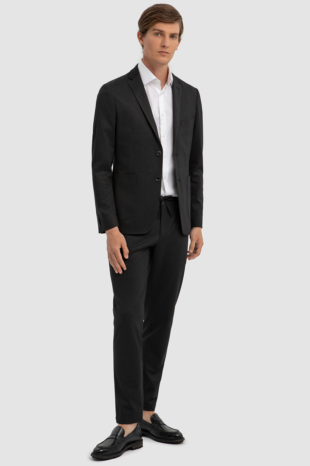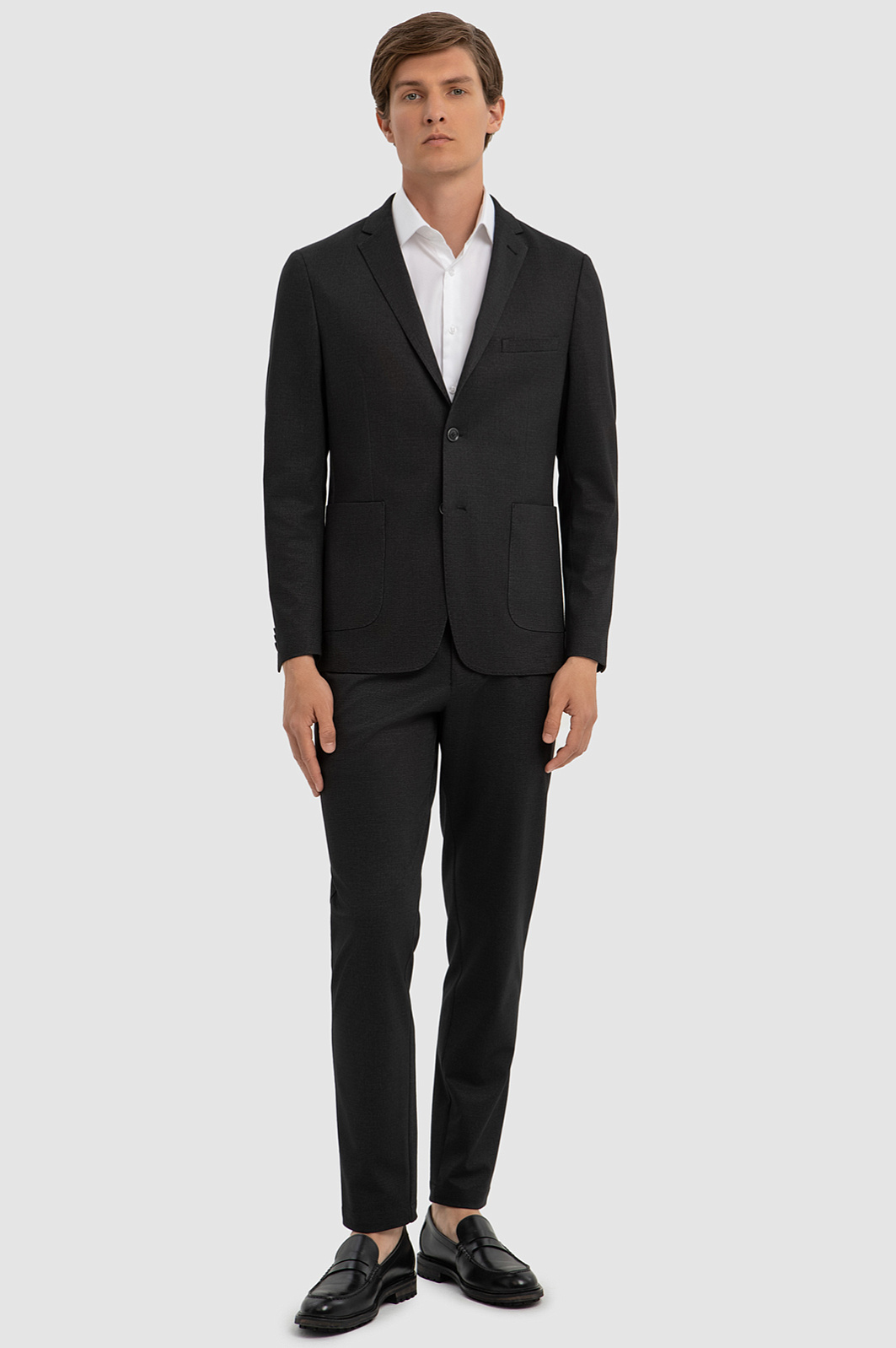Темно-серый однобортный пиджак KANZLER – классическая и в тоже время расслабленная модель, которая гармонично встроится как в деловой, так и в повседневный образ. Градус строгости понижают плавные скругленные линии накладных карманов и нижнего края. Двойная шлица обеспечивает свободу движения и придает образу динамичность. Приталенный крой садится точно по фигуре и создает аккуратный образ. Модель выполнили из высококачественного смесового материала на основе синтетического волокна, прочного, мягкого района и эластичного спандекса. Благодаря составу пиджак отлично сохраняет форму, пропускает воздух и впитывает влагу. Модель можно дополнить брюками из такого же материала. Параметры модели: рост 191, 97-77-99 Размер на модели: 50