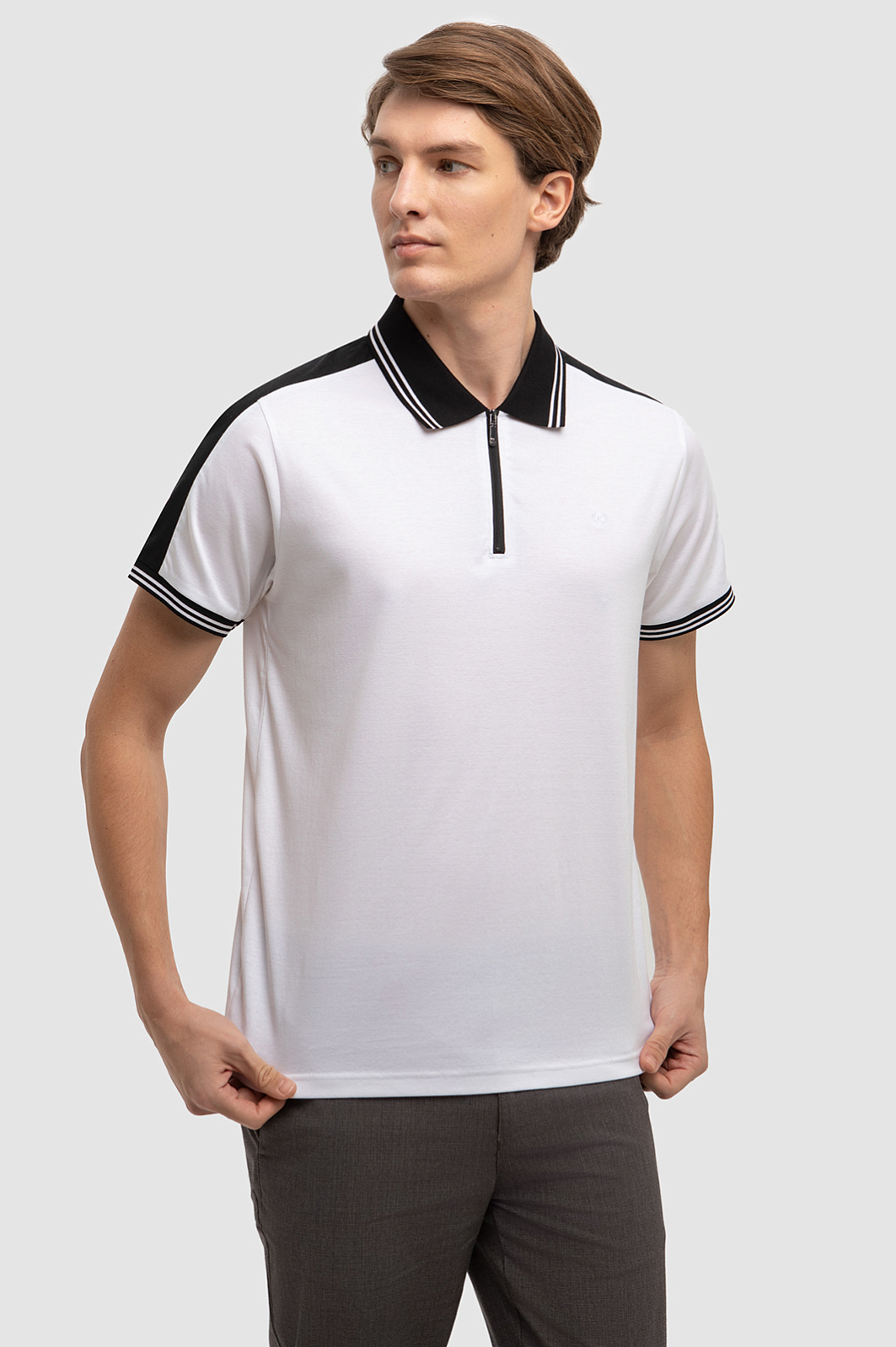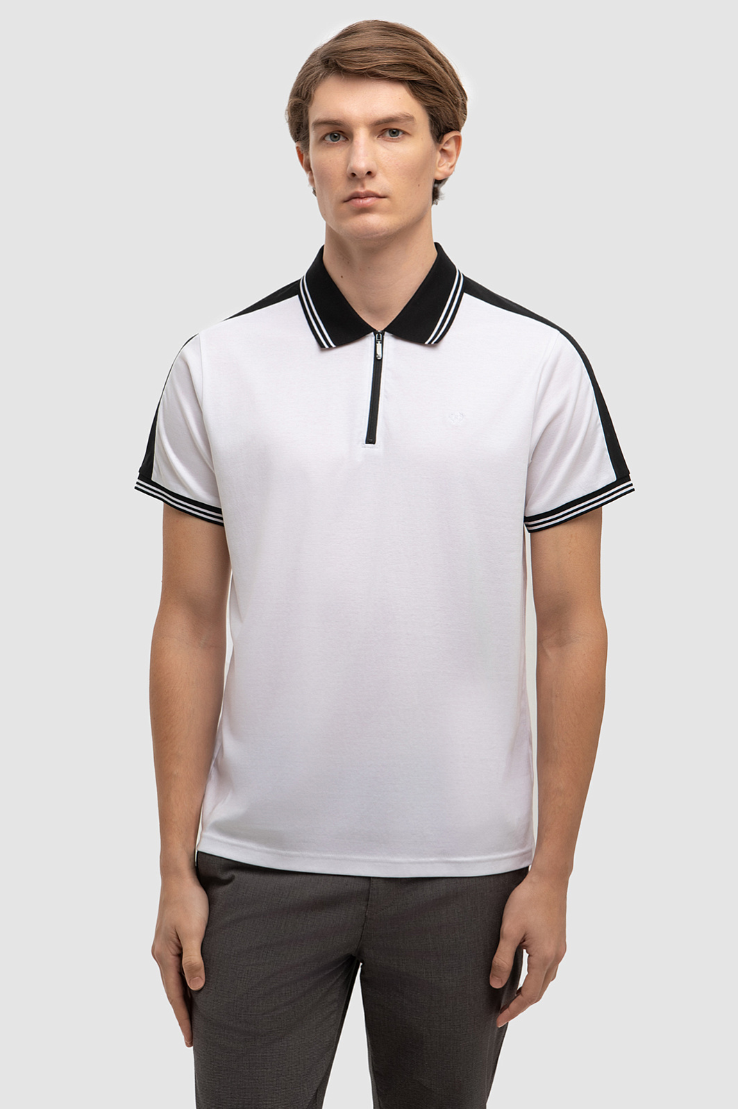 Поло с отложным воротником - главный фаворит современной моды, ставший классикой мужского гардероба. Белоснежное поло прямого кроя выглядит ярче и графичнее благодаря отделке черным цветом на воротнике, рукавах и манжетах изделия. Благородное черно-белое сочетание смотрится демократично и гармонично сочетается как с кежуал джинсами, так и с более деловыми моделями брюк. Дизайнеры выполнили модель из мягкого, прочного, но легкого и приятного на ощупь натурального хлопка. Поло KANZLER надолго сохраняет безупречный внешний вид, позволяя коже дышать. В качестве дополнительного декора - молния с фирменной буквой K. Параметры модели: рост 191, 97-77-99 Размер на модели: M