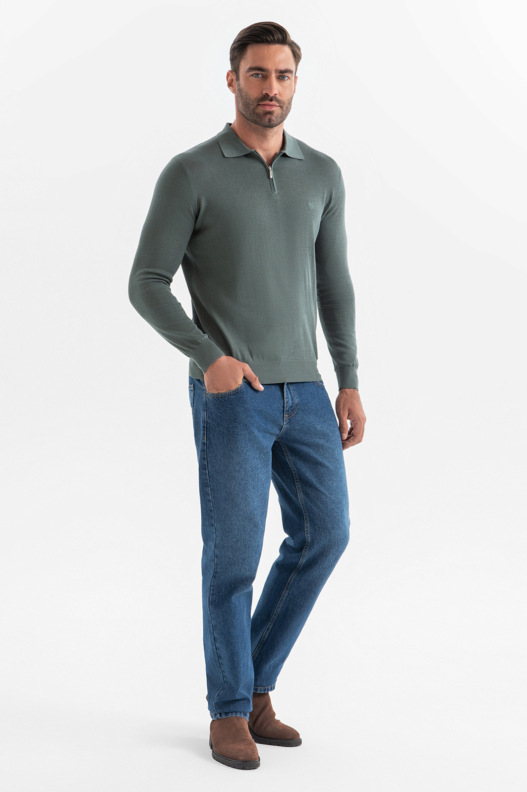 Поло KANZLER из хлопка, шёлка и льна - комфортная вещь, которая станет основой демисезонных образов. Модель с фирменным гербом и удобной застежкой на молнии идеально подчеркивает фигуру благодаря приталенному крою и подходит как для кежуал-образов, так и для более изысканных сочетаний. Главное преимущество изделия — премиальный состав. Смесь натуральных волокон — хлопка, шёлка и льна — обладает уникальными свойствами. Хлопок делает ткань дышащей и приятной на ощупь, лён обеспечивает лёгкость и прохладу, а шёлк добавляет изделию мягкость и лёгкий благородный блеск. Эта комбинация материалов не только гарантирует максимальный комфорт, но и подчёркивает статус и изысканность изделия. Цвет модели — глубокий бутылочный зелёный — настоящий тренд сезона. Он выгодно оттеняет кожу и легко комбинируется с классическими и повседневными вещами. Советуем носить это поло с брюками, чтобы создать стильный образ, который будет уместен как на прогулке, так и на деловой встрече. Параметры модели: рост 192, 108-83-102 Размер на модели: M