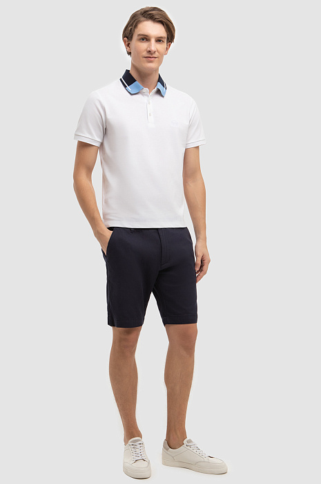 Универсальные прямые шорты KANZLER длиной чуть выше колена сшили из мягкого эластичного хлопка, поддерживающего хорошую циркуляцию воздуха. Материал получился одновременно комфортным, гипоаллергенным и экологичным. Благодаря посадке на кулиске модель комфортно садится на фигуре и не сковывает движения. Для важных мелочей предусмотрели карманы, а правую брючину дополнили патчем с логотипом бренда из натуральной кожи в тон фурнитуры. Привлекательное сочетание белого поло с контрастными деталями и синих шорт - пример современного стиля в большом городе. Белые кожаные кеды превосходно завершат образ.