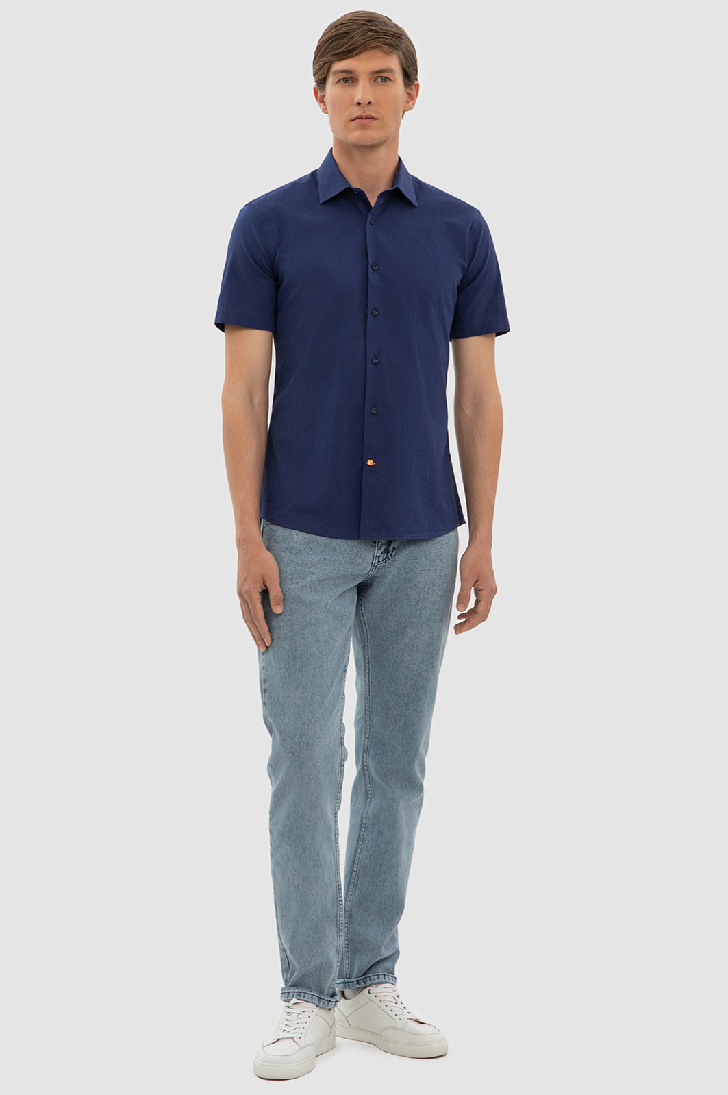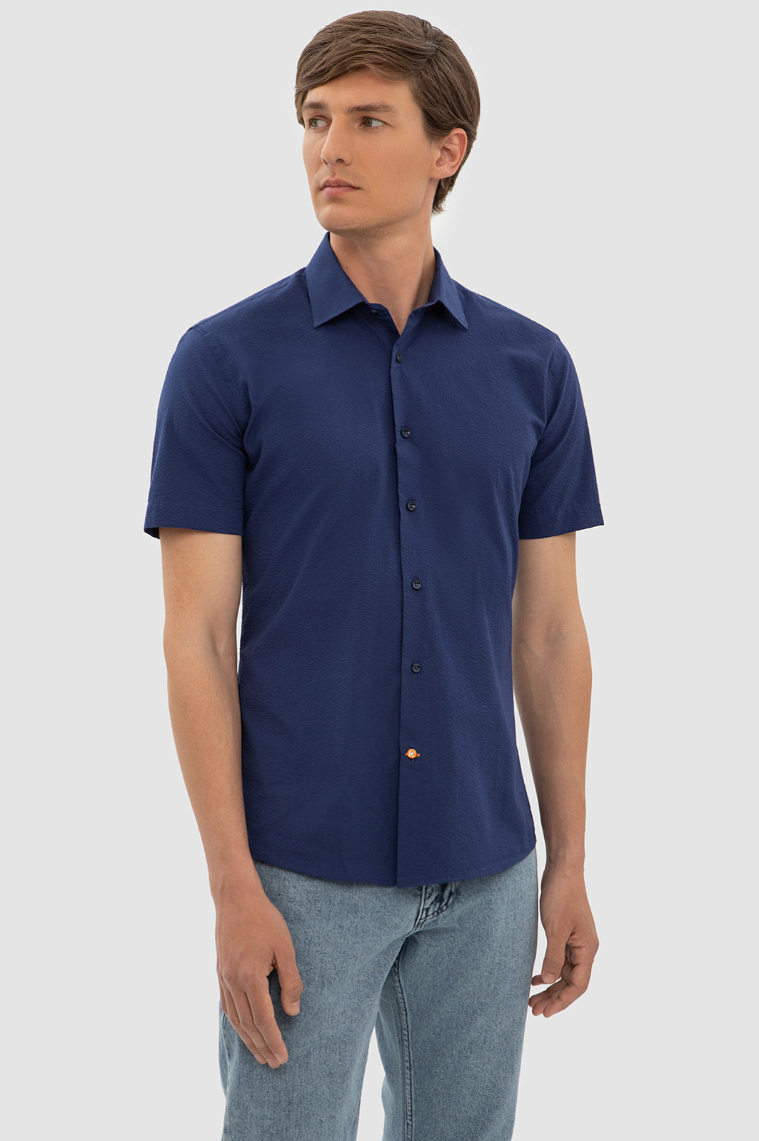 Элегантная сорочка KANZLER чернильно-синего оттенка с коротким рукавом украсит любой повседневный образ. Мягкая австрийская ткань Getzner с жатой фактурой и аккуратная акцентная деталь в виде оранжевой пуговицы на планке придают модели оригинальность, а лаконичный крой и Приталенный силуэт — долю спортивного шика. Мягкий материал из 100-процентного хлопка приятно облегает тело, сохраняя комфортную температуру. Универсальная практичная модель великолепно смотрится с джинсами и неформальными брюками и подходит для работы и отдыха в теплый сезон. Параметры модели: рост 191, 97-77-99 Размер на модели: 40