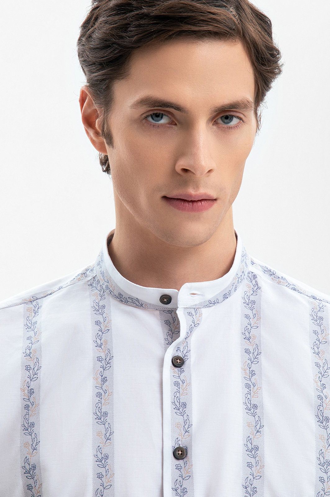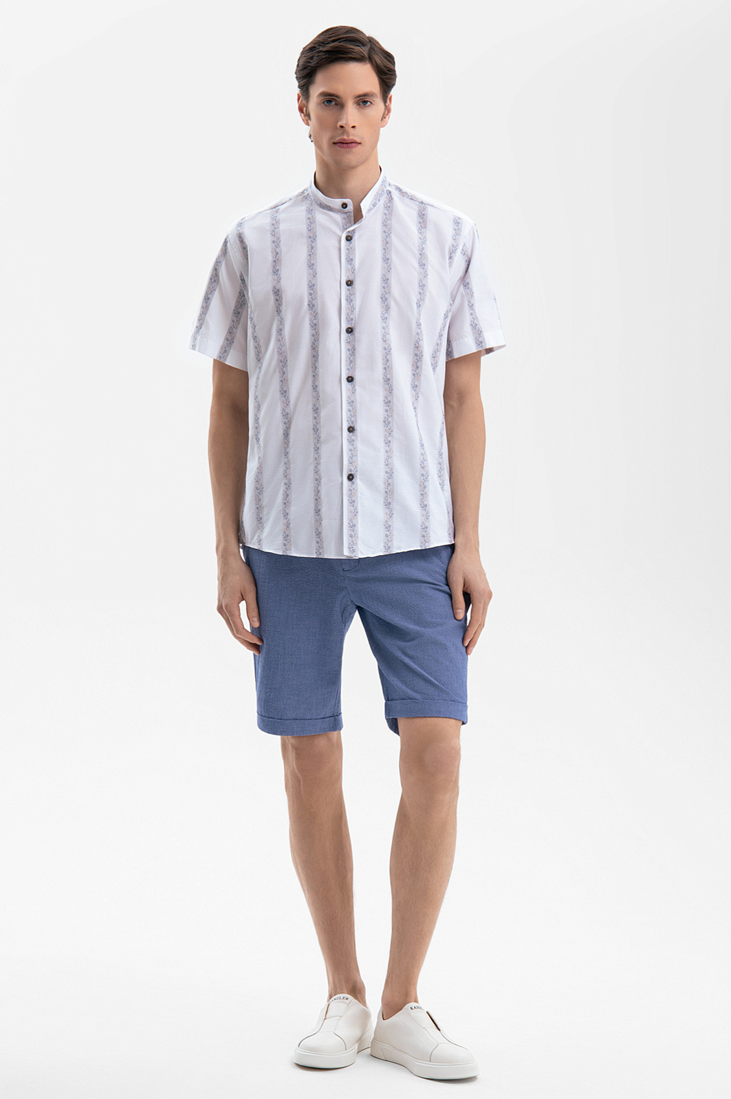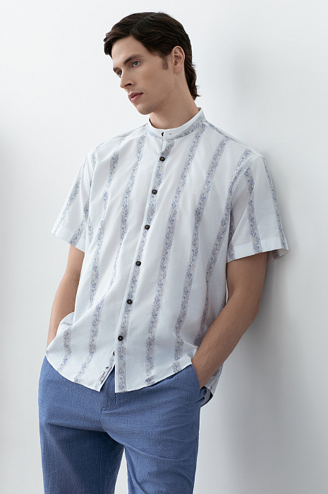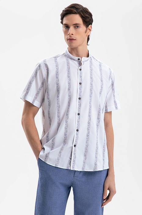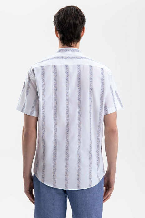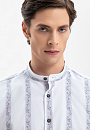 Белая сорочка KANZLER с ботаническим орнаментом создана для тех, кто ищет гармонию между строгостью и поэзией природы. Для ее пошива дизайнеры выбрали ткань от Getzner, мануфактуры с более чем 200-летней историей. 100% хлопок премиального качества, воздухопроницаемый и мягкий, практически не ощущается на коже, а плотное плетение волокон обеспечивает износостойкость. Узор в полоску с растительным принтом, словно оттиск старинной гравюры, добавляет образу глубину. Воротник-стойка добавляет модели изысканности и индивидуальности. Силуэт свободного прилегания не стесняет движений и сохраняет оптимальный воздухообмен.