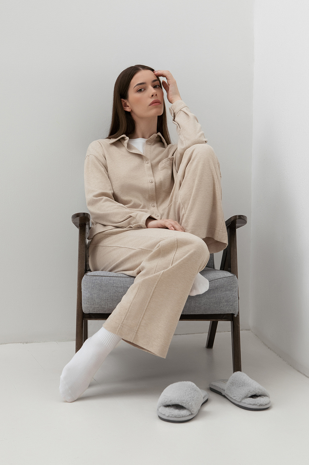 Сорочка KANZLER, воплощение философии неспешной жизни, превращает каждый момент в ритуал наслаждения. Песочный оттенок создает ауру спокойствия и безмятежности. Свободный силуэт не стесняет движений и мягко обволакивает тело, обеспечивая комфорт – во время утреннего кофе, прогулки, медитации или сна. Состав – идеально выверенный микс волокон: полиэстер обеспечивает прочность и устойчивость к деформации, вискоза дарит шелковистую гладкость и терморегуляцию, полиамид добавляет эластичности, акрил фиксирует форму, предотвращая усадку, а шерсть служит добавкой для сохранения тепла, не перегревая тело. Для создания цельного образа рекомендуем дополнить модель пижамными брюками из нашей коллекции.