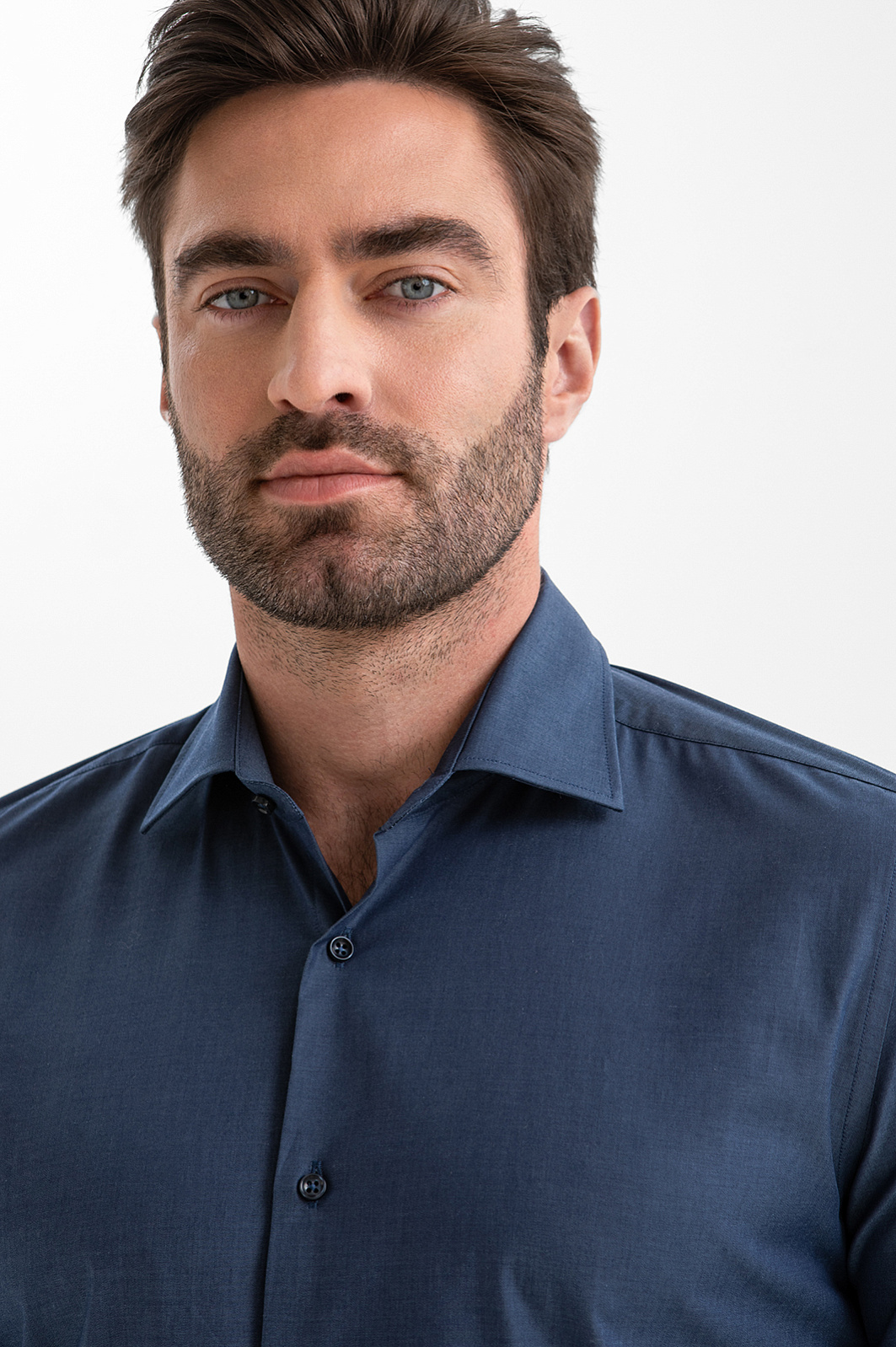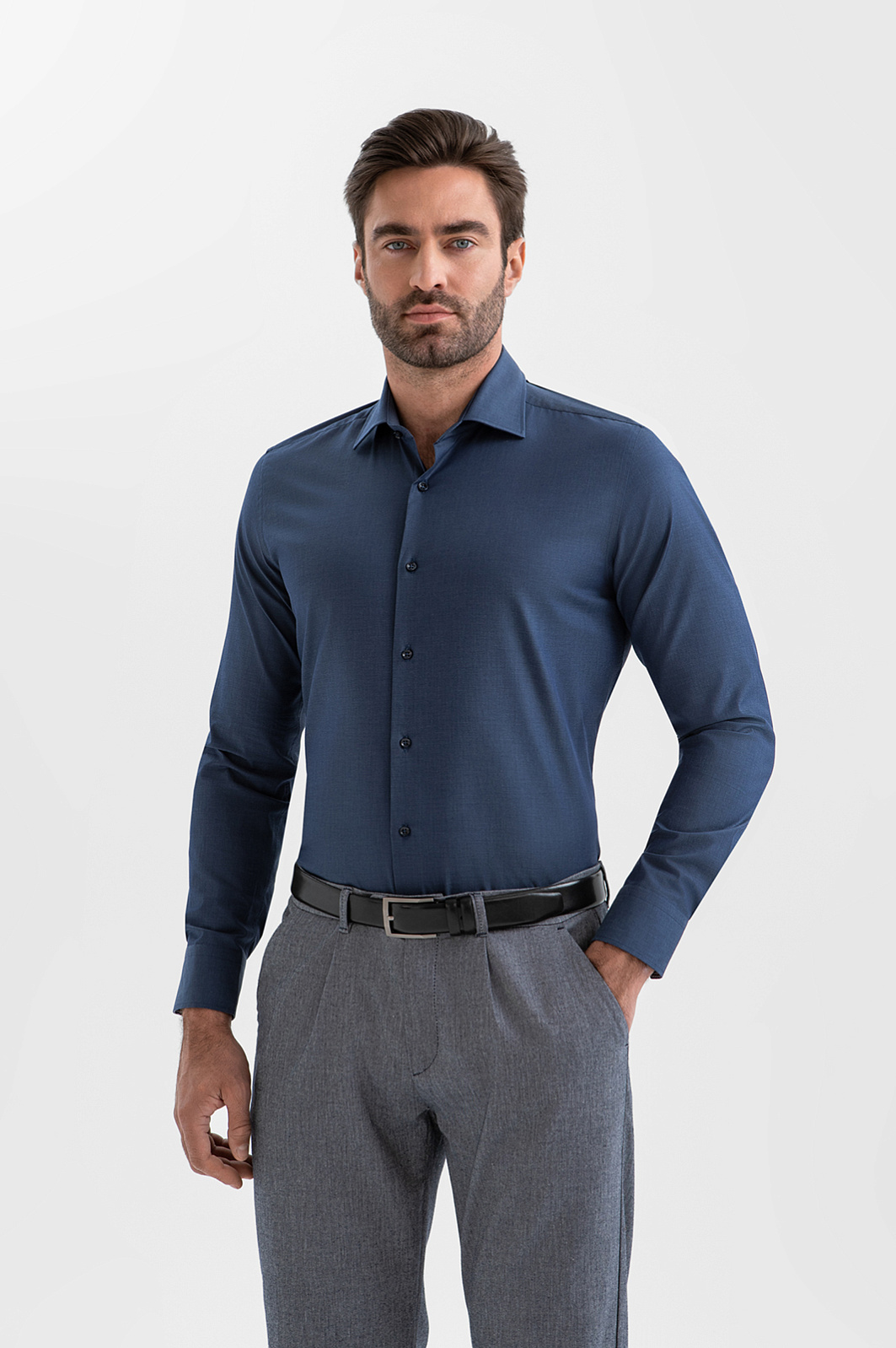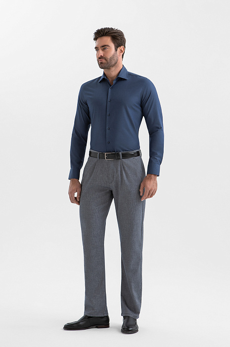 Сорочка KANZLER сумеречно-синего оттенка — воплощение сдержанной элегантности, шика и безупречного вкуса. Глубокий благородный цвет гармонично сочетается как с деловыми костюмами, так и с менее формальными повседневными вещами. Зауженный крой мягко обрисовывает контуры тела. Французская планка подчёркивает лаконичную простоту модели. Натуральный материал произведён старинной итальянской мануфактурой Tessitura Carlo Bassetti, которая специализируется на производстве роскошных рубашечных тканей. Гипоаллергенное полотно из хлопка (96%) отличается мягкостью и воздухопроницаемостью. Добавление эластана (4%) придаёт ему лёгкую эластичность и помогает сохранять форму.