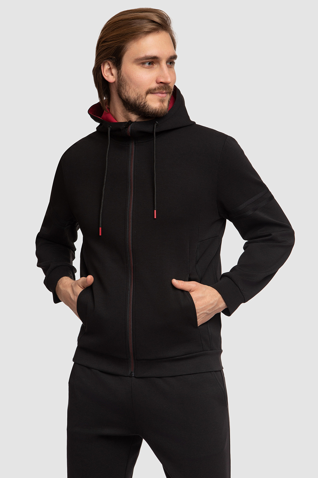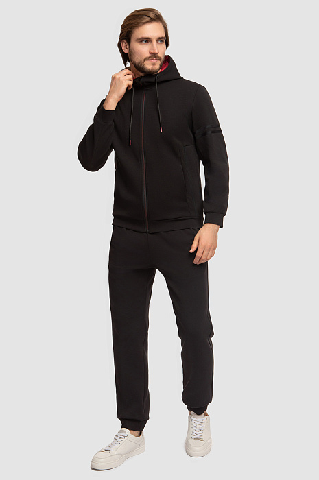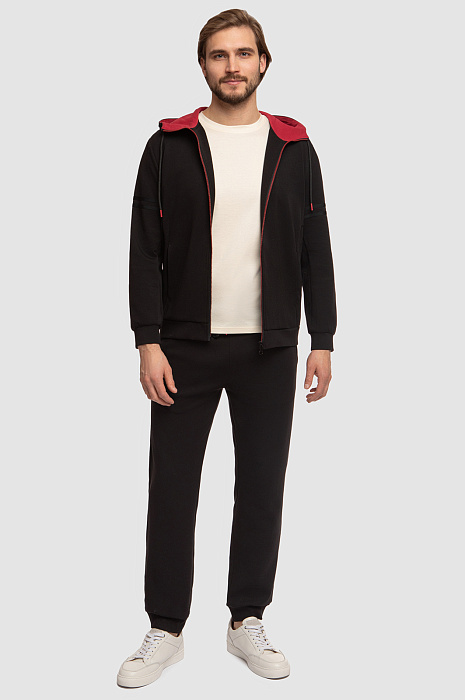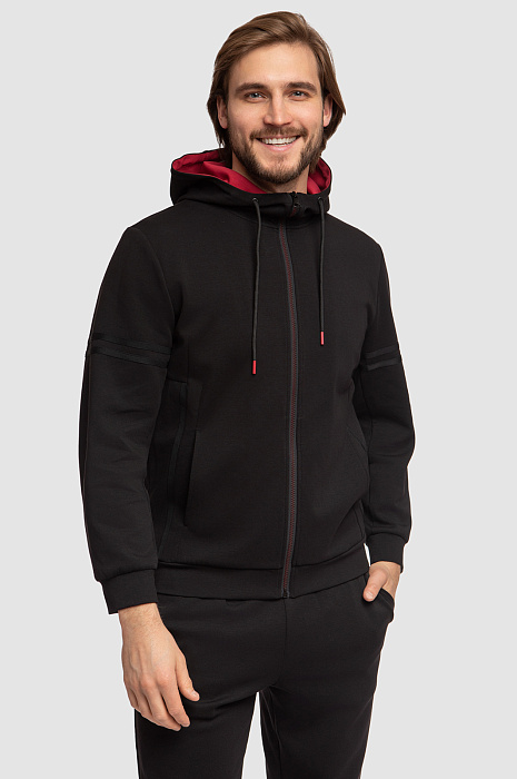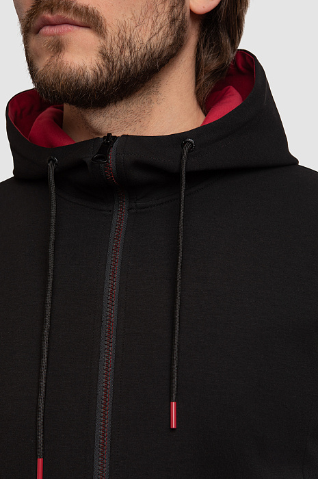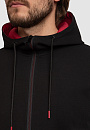 Черная толстовка KANZLER cтанет любимой вещью в практичном мужском гардеробе. На общее стильное впечатление работает базовый черный цвет в паре с красными элементами: объемный капюшон с контрастным внутренним слоем, молния и наконечники. Цветовые контрасты привлекают внимание и расставляют правильные акценты. Модель сшили из мягкого смесового материала на основе натурального хлопка, легкого нейлона и влагоустойчивого эластана. Дышащий трикотаж с плотным переплетением нитей сохраняет тепло тела, поэтому в изделии будет комфортно и в прохладную погоду на улице. Нейлон в составе гарантирует прочность изделия, а также малую сминаемость и устойчивость к растягиванию после стирок и активных видов спорта. Толстовка на молнии станет прекрасной альтернативой ветровке или кардигану в образах в стиле спорт-шик. Параметры модели: рост 187, 100-81-97 Размер на модели: М