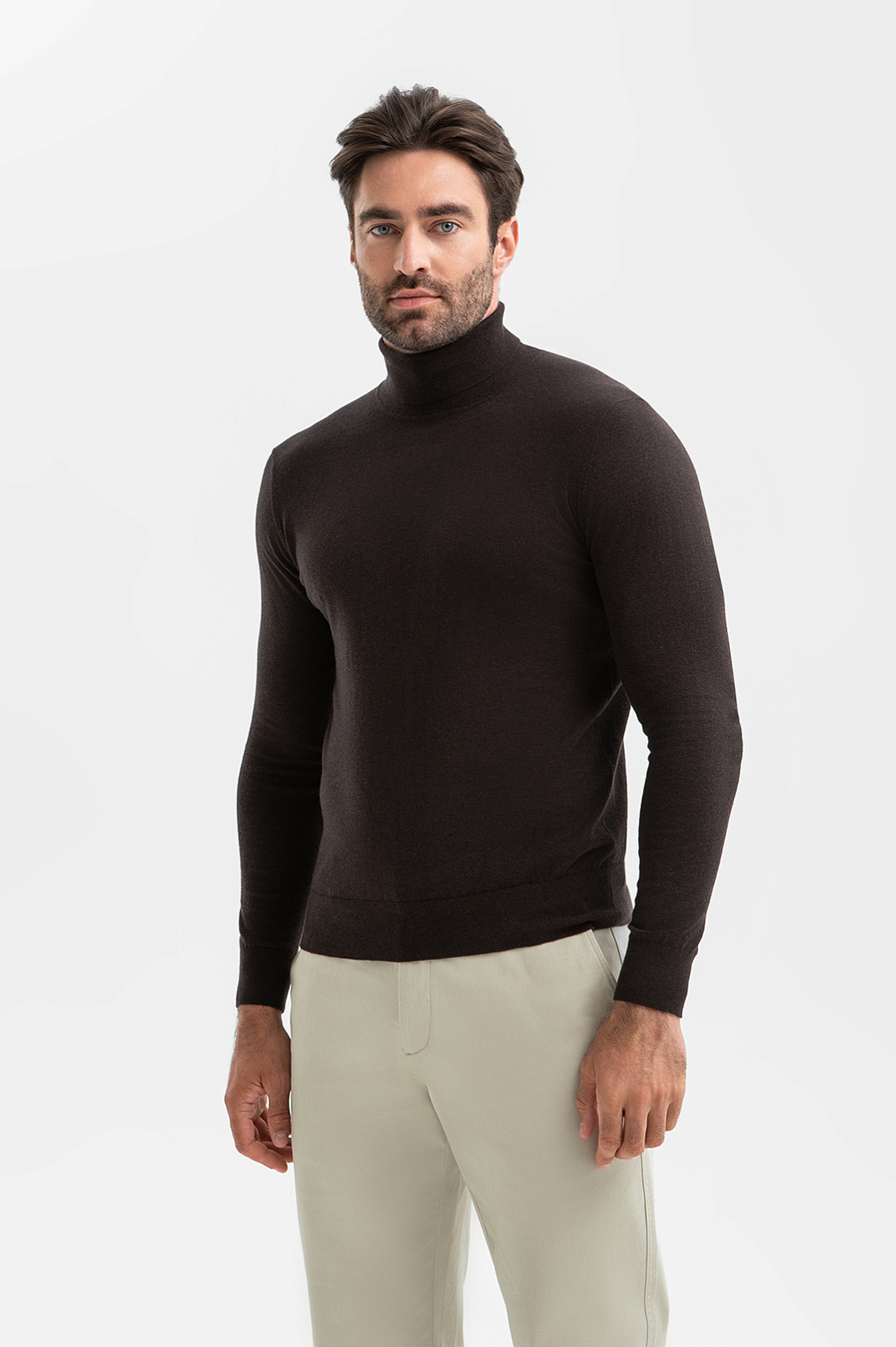 Водолазка KANZLER в оттенке горького шоколада – воплощение сдержанной роскоши для деловых и кежуал образов. Натуральный материал сочетает практичность хлопка с исключительной мягкостью кашемира. Гипоаллергенные волокна хлопка обеспечивают идеальный воздухообмен и терморегуляцию, а добавление кашемира сохраняет тепло, не перегревая тело. Прочный воротник-стойка защищает от ветра, а резинка на манжетах и по низу обеспечивает аккуратную посадку. Темно-коричневый оттенок придает образу благородную строгость и универсальность – от деловых встреч до вечерних выходов. Параметры модели: рост 192, 108-83-102 Размер на модели: M