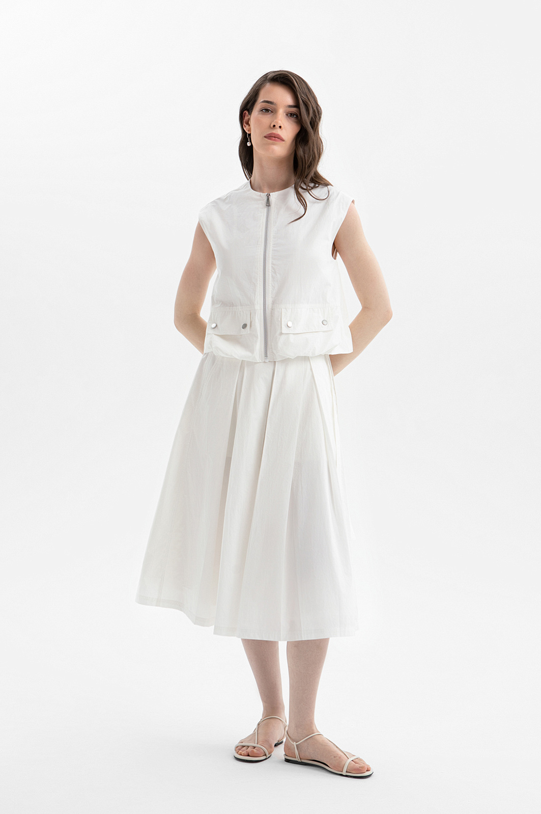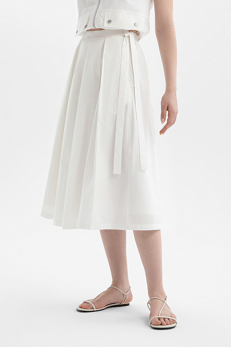 Роскошная белая юбка-миди KANZLER из хлопка — стильная и универсальная модель, которая легко вписывается в летние образы. Белый цвет придаёт ей свежесть и благородство. Передняя часть оформлена мягкой широкой драпировкой. Удлинённый пояс со свободно ниспадающими концами служит непринуждённым акцентом. Боковые карманы аккуратно спрятаны в швах и остаются почти незаметными, сохраняя безупречные линии кроя. Основная часть и подкладка выполнены из чистого хлопка. Его гипоаллергенные воздухопроницаемые волокна поддерживают ощущение свежести и берегут тело от перегревания в жаркие дни.