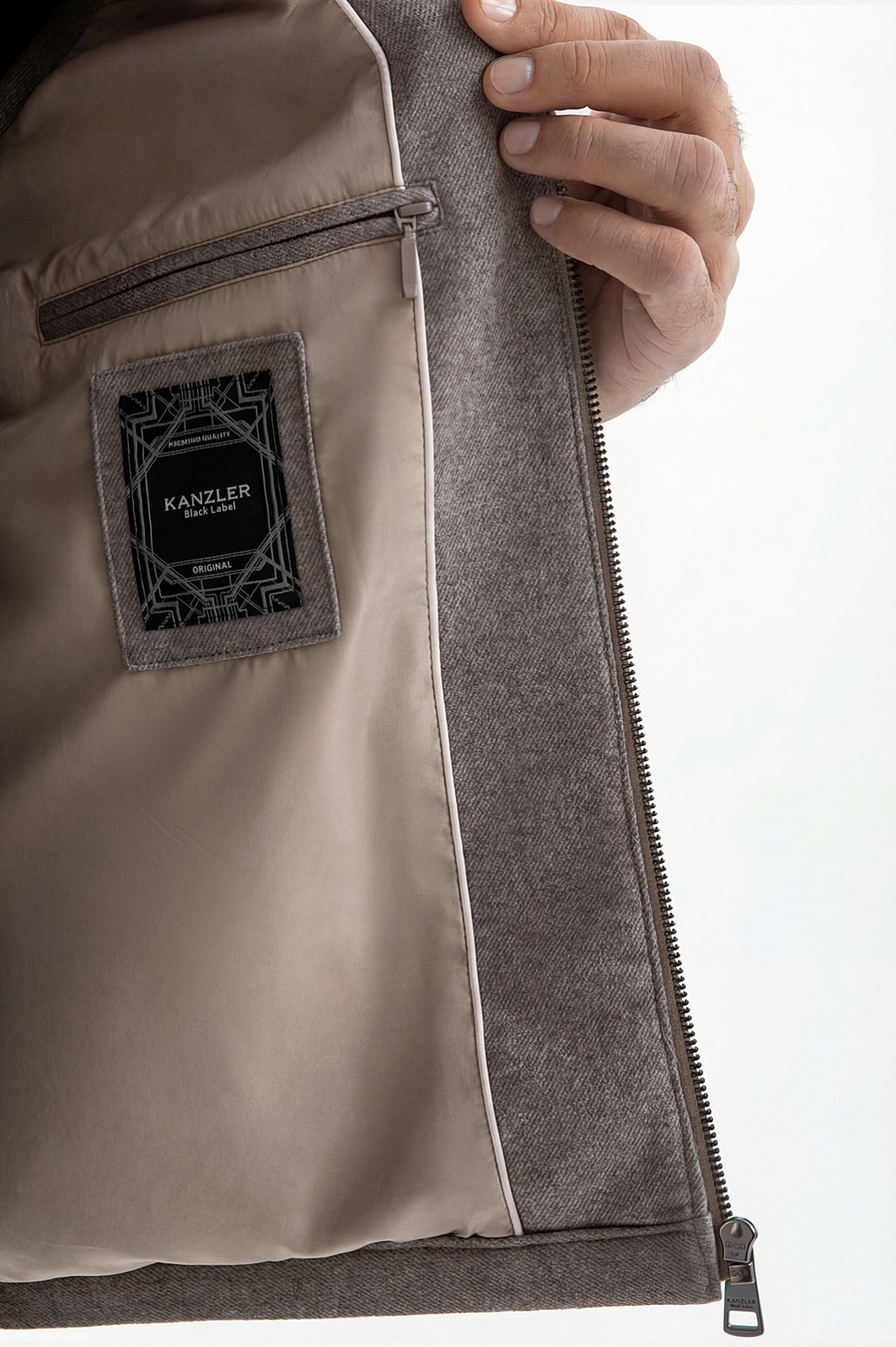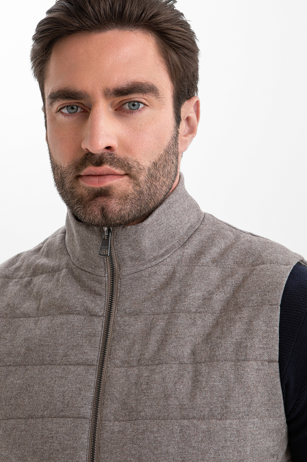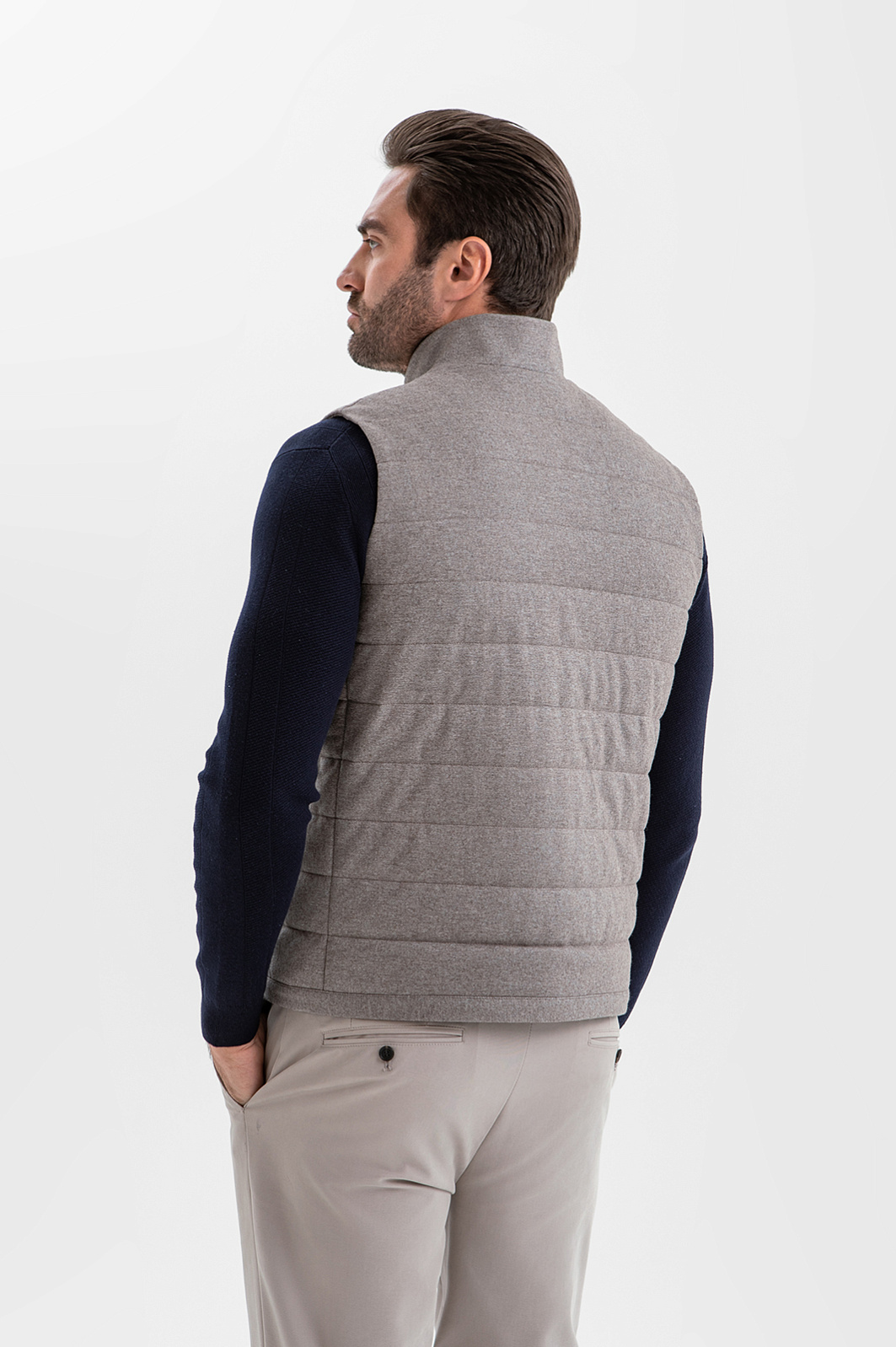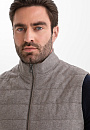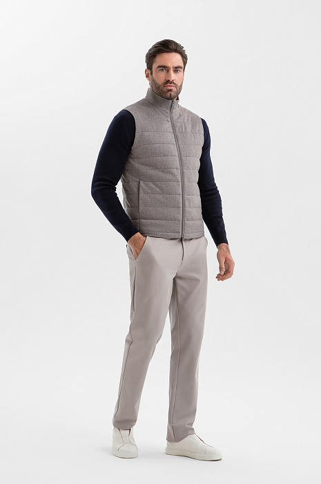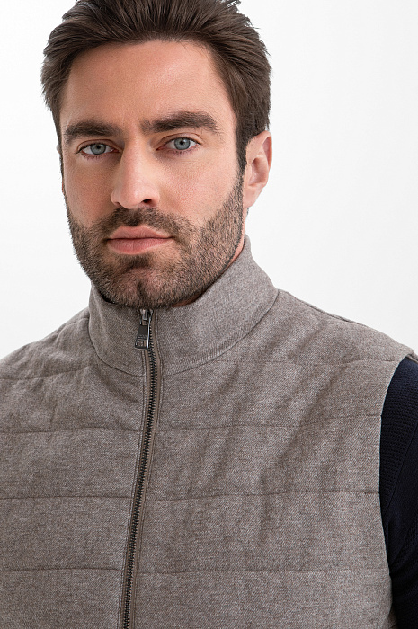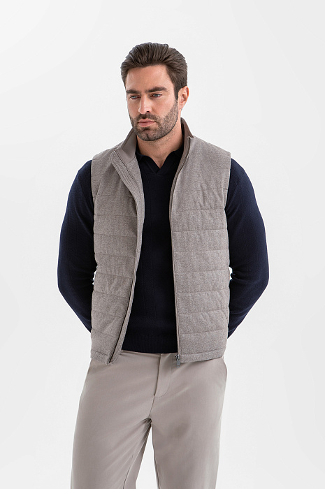 Стёганый жилет KANZLER на молнии в благородном серо-бежевом оттенке — находка для прохладных дней и межсезонья, которая пригодится в поездке и на отдыхе. Он служит в качестве дополнительного слоя или лёгкой верхней одежды, которую надевают поверх классической рубашки или джемпера. Строгая архитектура и чистые линии силуэта заданы лаконичным кроем с высоким воротником-стойкой. Расположенные в боковых швах карманы практически незаметны, но вполне функциональны. Плотная саржевая ткань из натуральной шерсти с добавлением прочного полиэстера и мягкого хлопка хорошо защищает от ветра и создаёт ощущение уюта.